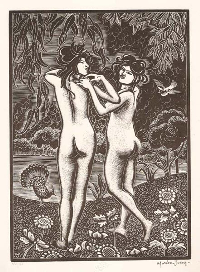 xilografia, nudi, pavoni, primavera